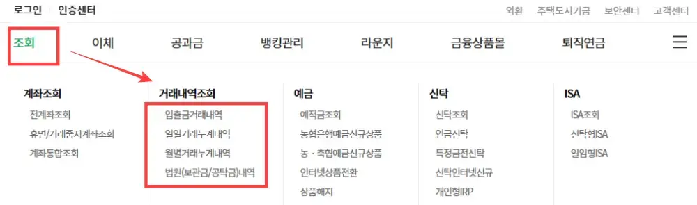 - 메인 홈페이지에서 조회 메뉴 선택 후 거래내역조회를 선택 합니다.