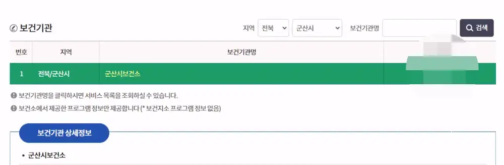 - 보건기관 상세정보에서 해당 보건소의 위치, 전화번호, 홈페이지 주소를 확인합니다.